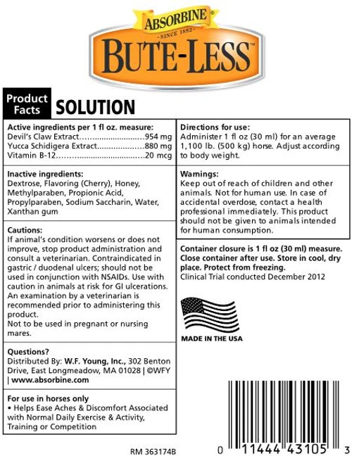 Bute-Less Solution from Absorbine, formerly called Equine America B-L Solution, is the pain relief formula for your horse you’ve relied on for years. Bute-Less uses effective natural ingredients to alleviate aches, pains, and discomfort in horses due to exercise and activity. Bute-Less contains Yucca Schidigera Extract, Devil’s Claw Extract, and Vitamin B-12 in an easy to administer liquid base. Simply add a measured dose to your horse’s grain or pelleted feed and they’ll get the benefits of the pain relieving formula. Gentle on the stomach and can be used for long-term comfort and recovery support. Bute-Less is a great product to provide relief for the injured horse that’s on lay-up, without the associated problems of prescription drugs.