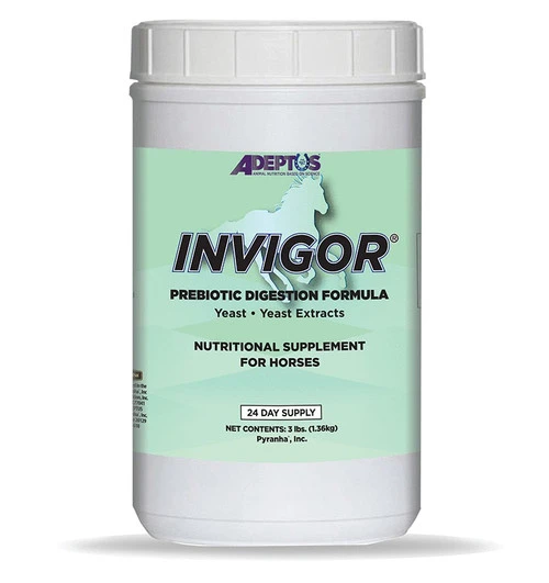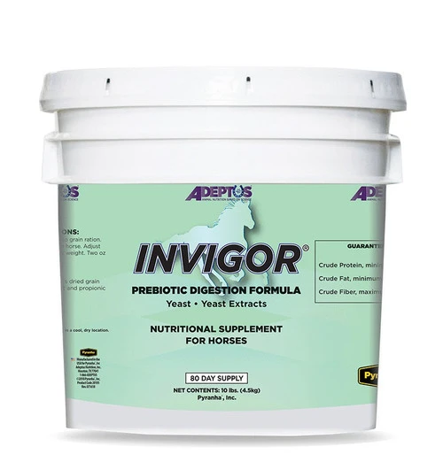 Invigor by Adeptus is a nutritional digestion and stress alleviation formula for sensitive horses Invigor is a quality prebiotic to enhance digestion for any horse, but especially those with uncomfortable digestive disturbances like loose stools, hay belly, or even laminitis and colic. Stressful situations like rigorous training, travel, or feed changes can trigger digestive upset in many horses. Be prepared with Invigor, the clinically tested and proven product from Adeptus.