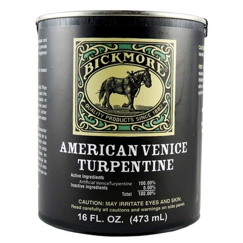 Bickmore American Venice Turpentine is a horse hoof treatment that promotes circulation and new hoof growth. It acts as a hoof toughener and helps eliminate discomfort during rigorous training. Venice turpentine has been used by horsemen for years to keep the soles of racehorses tough and reduce stinging and by farriers to treat issues in the horse’s foot. Bickmore’s American Venice Turpentine is an antibacterial agent that disinfects hooves. It stimulates new hoof growth by acting as a counter-irritant. American Venice Turpentine is an artificial version of venice turpentine. Original venice turpentine is a tree resin, specifically from the Austrian Larch tree, that is still used by artists and art conservators. Bickmore’s American Venice Turpentine is an artificial formulation with a clear yellow appearance and honey-like consistency. It does not form a barrier or seal off the hoof surface.