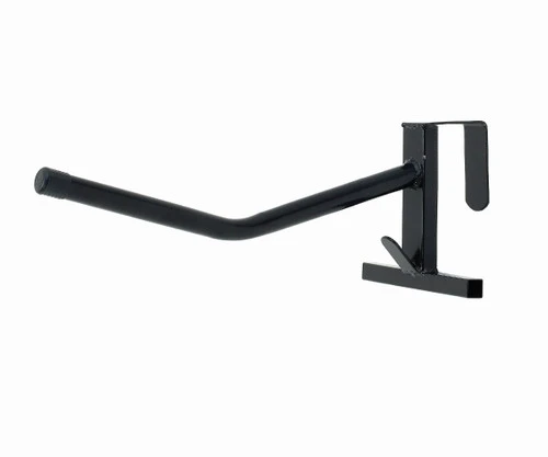 This Equi-Essentials Portable Single Arm Saddle rack hooks onto a stall wall or board fence. Features bridle hook underneath. Black.