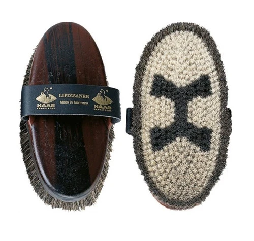 Lipizzaner body brush is designed for use after using a curry to remove heavier dirt or mud. This smaller size (for smaller hands) Haas Lipizzaner Brush measures 200 mm x 85 mm. Beautiful horse grooming brush from HAAS has a wooden block with comfortable strap.