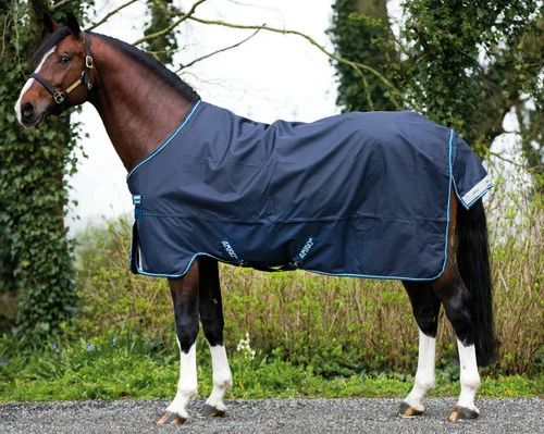 The Amigo Bravo 12 Lite Turnout is designed with a Surefit Neck with V-front closure that allows optimal comfort and freedom of movement to eat and graze. Horseware Ireland sturdy rain sheet features contoured leg arches, tail flap, cross surcingles, and reflective strips for safety. Great looking horse no-fill turnout sheet offers a classic look in Navy.