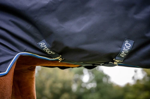 This Horseware Ireland Amigo Bravo medium weight winter horse blanket has 250 grams of fibrefill for warmth. The leg arches, cross surcingles, and wide tail flap are all designed for horse comfort and ease. Horseware Amigo Bravo 12 Turnout has reflective strips for safety and a classic navy color with strong blue/silver trim.