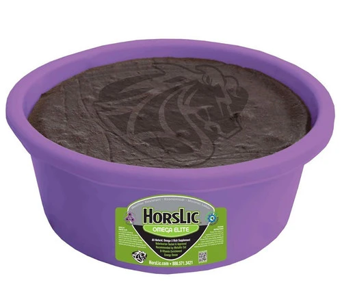 The unique Horslic Omega Elite supplement provides vital nutrients to your horse while keeping her amused in pasture or stall. The low moisture, dense, solid supplement in the bright purple tub contains electrolytes, minerals, omega-3 fatty acids and more to help your horse stay hydrated, maintain muscle, and enhance digestion.