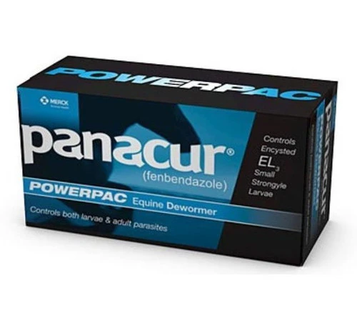 Panacur PowerPac is recommended for horses in the Spring and Fall as part of a regular deworming program and as treatment for horses with an active parasite infestation. The active ingredient, 10% Fendbendazole, is highly effective on larvae and adult parasites and especially encysted small strongyles (parasites imbedded in intestinal tissue). A PowerPac may be indicated if horse is exhibiting signs like weight loss, diarrhea, “hay belly”, or abdominal distress. Check with your vet.
