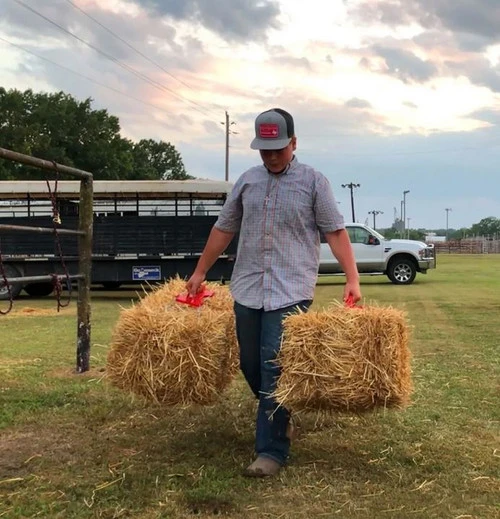 The Reinsman Bale Handle has “wings” that lock onto the strings so they don’t slip. The bale is secure and stays level so you can lift it with the handle and start walking. If you get two Bale Handles, you can even carry two bales at a time! The Reinsman Bale Handle makes a great gift for horse and ranch owners.