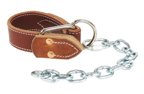 Schutz Brothers AD Kicking Chain is designed to stop horses from kicking, pawing, and pacing. Destructive behaviors are annoying and can be dangerous. The kicking chain is an immediate deterrent to negative actions. Horses do not like the feel of the chain as they kick so they quickly learn that it’s easier and more pleasant for them if they don’t kick. Quality harness leather is stitched and finished for durability.
