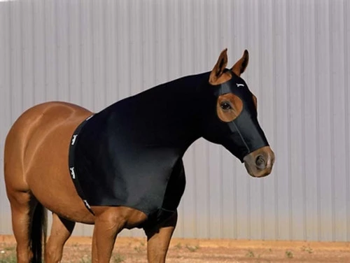 Jammies stretch hoods from Toklat. Keeps even the messiest horses clean. Tames wild manes and keeps coats shiny and healthy-looking. Keeps shavings dust and dirt out of manes and show braids. 4-way stretch nylon Lycra provides a perfect fit. Zipper makes dressing your horse hassle-free. Durable, contoured buckle provides easy closure. Seamless face design keeps hood out of horse’s sensitive tear ducts. Wide band satin elastic keeps muzzle free from chafing.