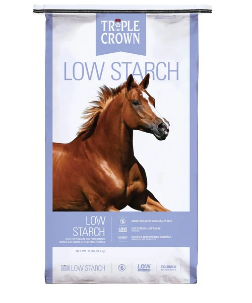 A super premium pelleted feed with no soybean meal for mature horses. Triple Crown Low Starch is grain, alfalfa, and molasses free making it ideal for horses with insulin resistance, HYPP, PPID, EPSM, or PSSM.