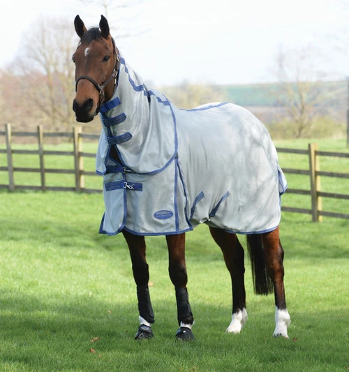 The ComFiTec Airflow II Fly Sheet is a UV protective polyester mesh that is soft yet designed to last. The shoulders are lined with 210T nylon to prevent rubs while shoulder gussets allow easy movement. There are elasticated leg straps that are adjustable and removable. Give your horse the comfort and protection needed for a happier fly season! In neutral Grey with Blue trim.